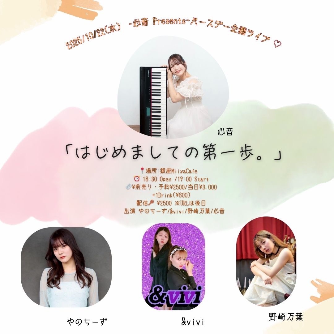Night Time 有観客+配信 『 -心音 Presents-バースデー企画ライブ「はじめましての第一歩。」 』18:30open / 19:00start Charge 前売り・予約 2,500円 / 当日3,000円 【配信チケット】2,500円(税込) = 出演 =※心音さんの初めてのバースデー企画イベントです♪ ※来場チケットは、各アーティストさんまで 配信チケットはこちらからアーティスト応援ギフト |