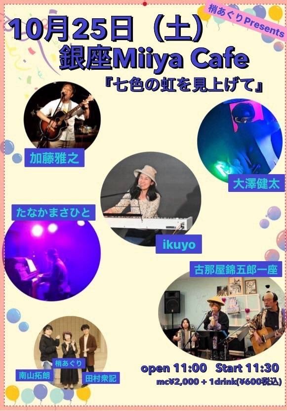 Day Time 有観客+配信 『 七色の虹を見上げて 』11:00open / 11:30start Charge 前売り・予約2,000円 +drink order(600円) 【配信チケット】2,000円(税込) = 出演 =加藤雅之 たなかまさひと 古那屋錦五郎一座 大澤健太 ikuyo 梢あぐり