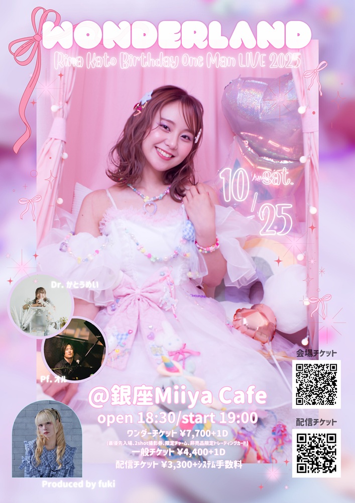 Night Time 有観客+配信 加藤梨菜 Birthday ONE MAN LIVE 2025 『Wonderland』produced by fuki18:30open / 19:00start [ワンダーチケット]¥7,700 +drink order(600円) ※最優先入場、2shot撮影券、限定チャーム、非売品限定トレーディングカード [一般]¥4,400+drink order(600円) 【配信チケット】3,300円(税込)+システム手数料 ※加藤梨菜さんのバースデーワンマンライブです♪ = 出演 =加藤梨菜 fuki Special Band Member Pf オル Dr かとうめい ※来場チケットは、アーティストさんまで 配信チケットはこちらからアーティスト応援ギフト |