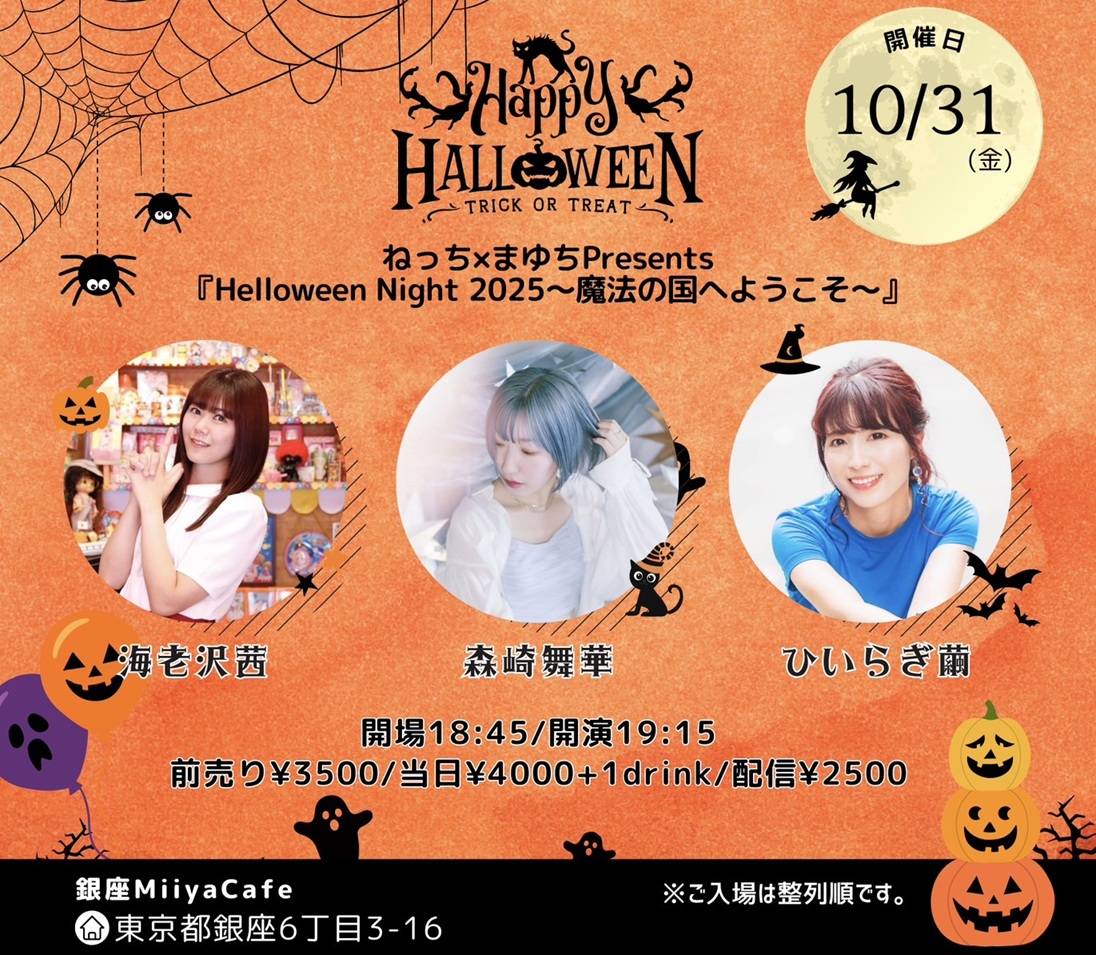 Night Time 有観客+配信 ねっち×まゆちPresents 『Halloween Night 2025~魔法の国へようこそ~』18:45open / 19:15start Charge 前売り・予約 3,500円 / 当日4,000円 【配信チケット】2,500円(税込) = 出演 =