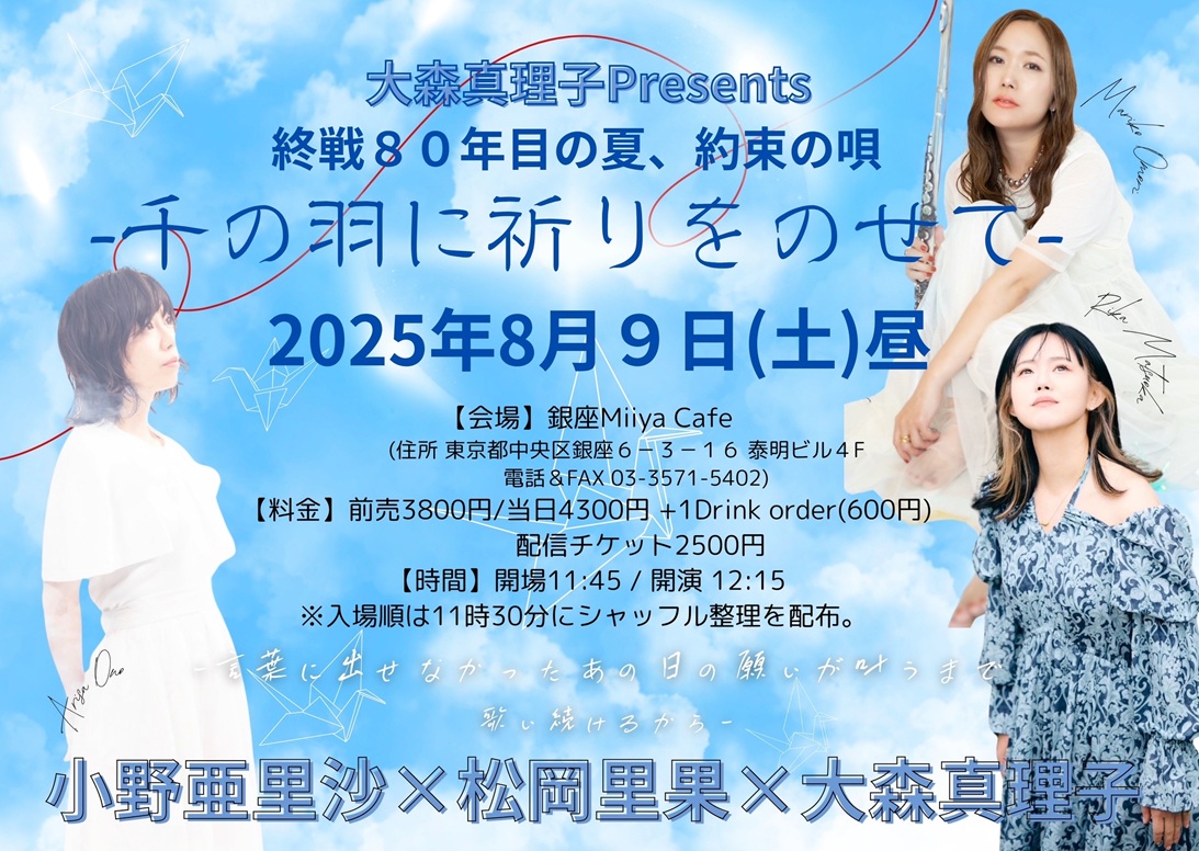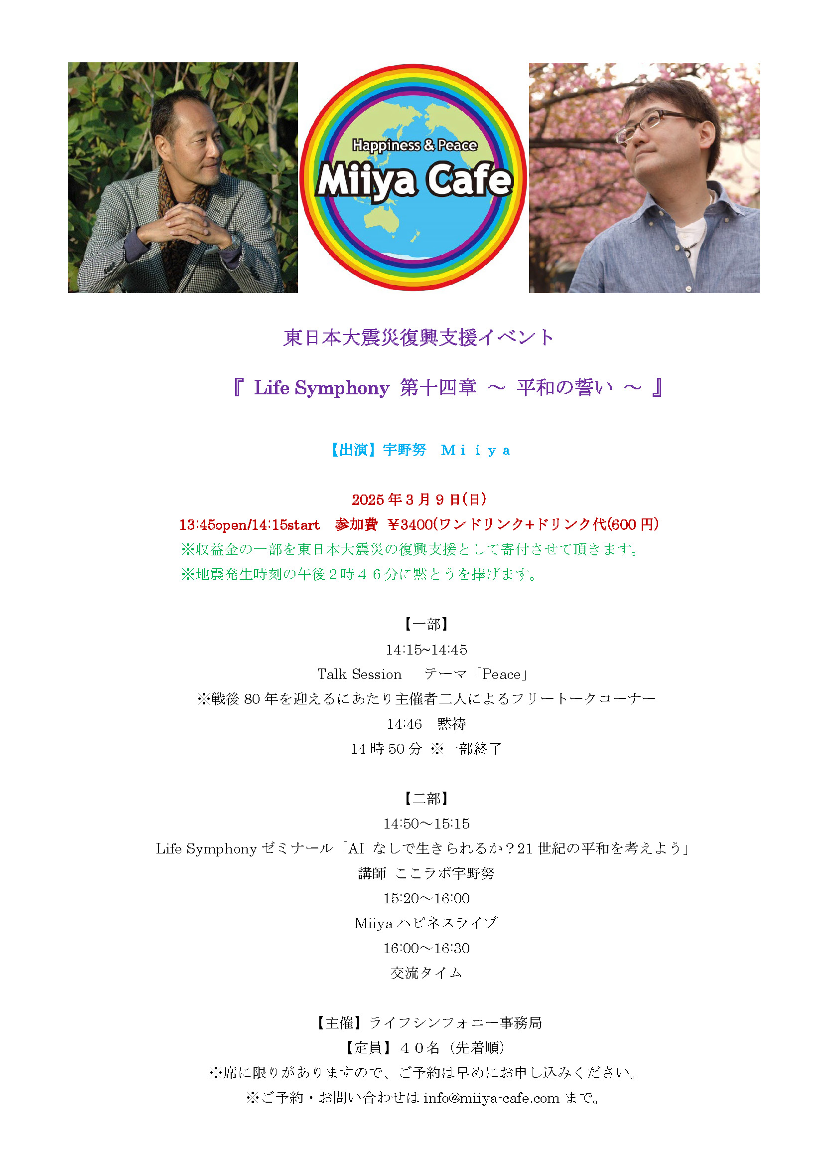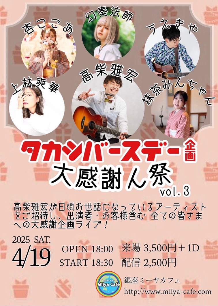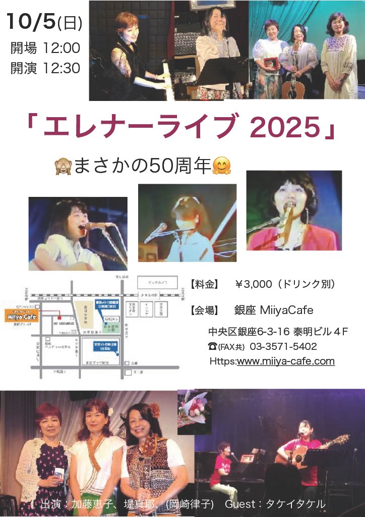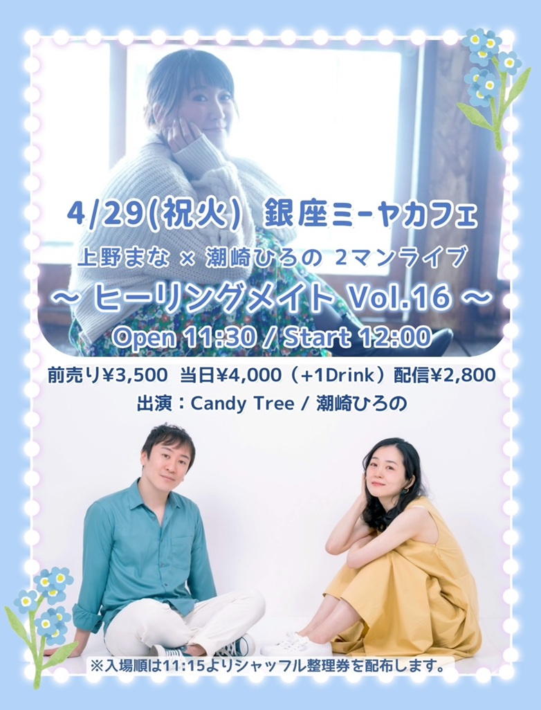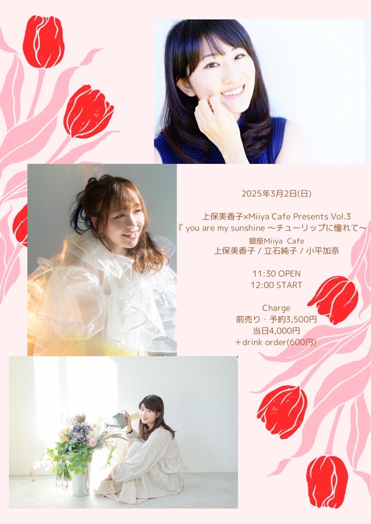 ~ Back to the Miiya Cafe!! ~ これまでたくさんのアーテイストが歌いに、 演奏しに、演じにきてくれました♪ そして、たくさんのお客様にお越しいただき、たくさんの笑顔と幸せの花が咲きました☆ 本当にありがとうございました。心より感謝申し上げます。 想い出のフライヤーを少しずつ掲載します♪