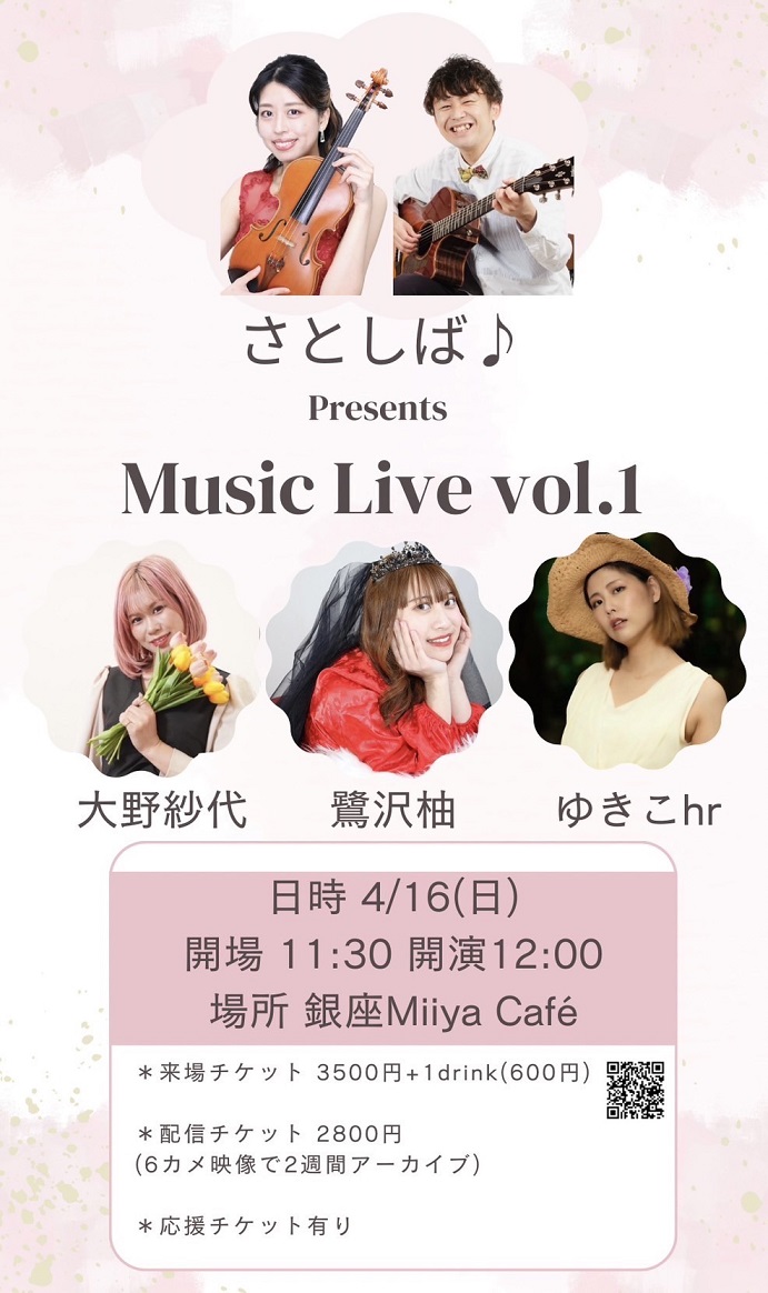 Day Time 有観客+配信 『 さとしば♪ Presents Music Live Vol.1 』11:30open / 12:00start Charge 前売り・予約3,500円 / 当日4,000円 +drink order(600円) 【配信チケット】2,800円(税込) さとしば♪さん主催の企画ライブです☆ = 出演 =※来場チケットは、各アーティストさんまで 配信チケットはこちらからアーティスト応援ギフト |
