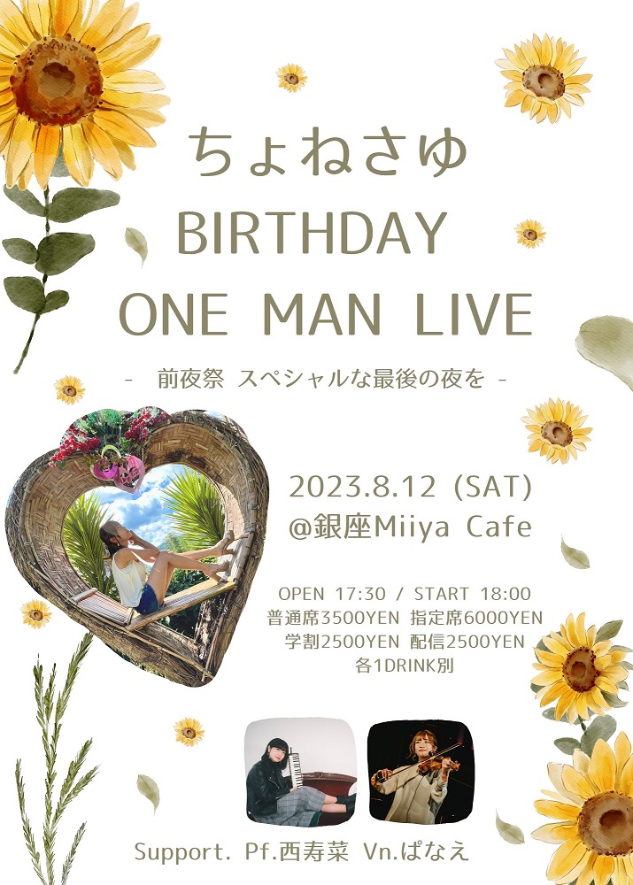 Night Time 有観客+配信 『 ちょねさゆ BIRTHDAY ONE MAN LIVE 』- 前夜祭 スペシャルな最後の夜を -17:30open / 18:00start Charge 普通席3,500円 指定席6,000円 学割2,500円+drink order(600円) 【配信チケット】2,500円(税込) = 出演 =Support. Pf.西寿菜 Vn.ぱなえ ※来場チケットは、アーティストさんまで 配信チケットはこちらからアーティスト応援ギフト |