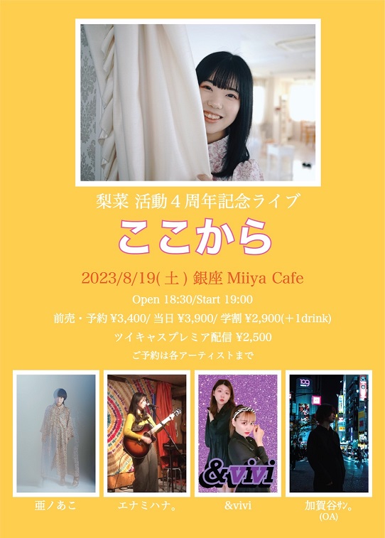 Night Time 有観客+配信 梨菜 活動4周年記念ライブ 『 ここから 』18:30open / 19:00start Charge 前売り・予約3,400円 / 当日3,900円 / 学割2,900円 【配信チケット】2,500円(税込) ※梨菜さんの活動4周年記念イベントです♪ = 出演 =※来場チケットは、各アーティストさんまで 配信チケットはこちらからアーティスト応援ギフト |