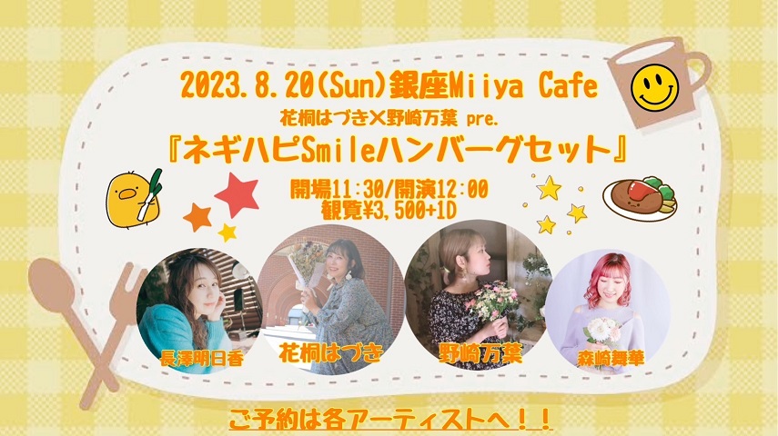 Day Time 有観客+配信 花桐はづき×野崎万葉 企画 『 ネギハピsmileハンバーグセット 』11:30open / 12:00start Charge 前売り・予約3,500円 / 当日4,000円 【配信チケット】2,500円(税込) ※花桐はづきさんと野崎万葉さん共催のイベントです☆ = 出演 =※来場チケットは、各アーティストさんまで 配信チケットはこちらからアーティスト応援ギフト |