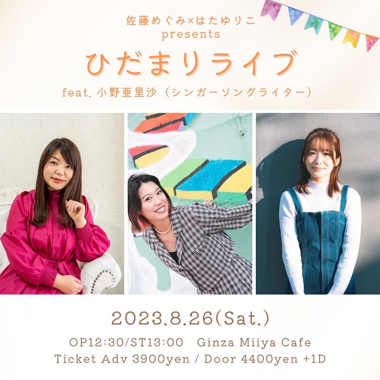 Day Time 有観客+配信 『 佐藤めぐみ×はたゆりこpresents ひだまりライブ feat. 小野亜里沙 』12:30open / 13:00start Charge 前売り3,900円 / 予約4,400円 +drink order(600円) 【配信チケット】2,500円(税込) ※佐藤めぐみさんとはたゆりこさんの主催イベントです。シンガーソングライター小野亜里沙さんをお招きして、 心身を整えるための音楽と言葉をお届けします♩ = 出演 =佐藤めぐみ はたゆりこ 小野亜里沙