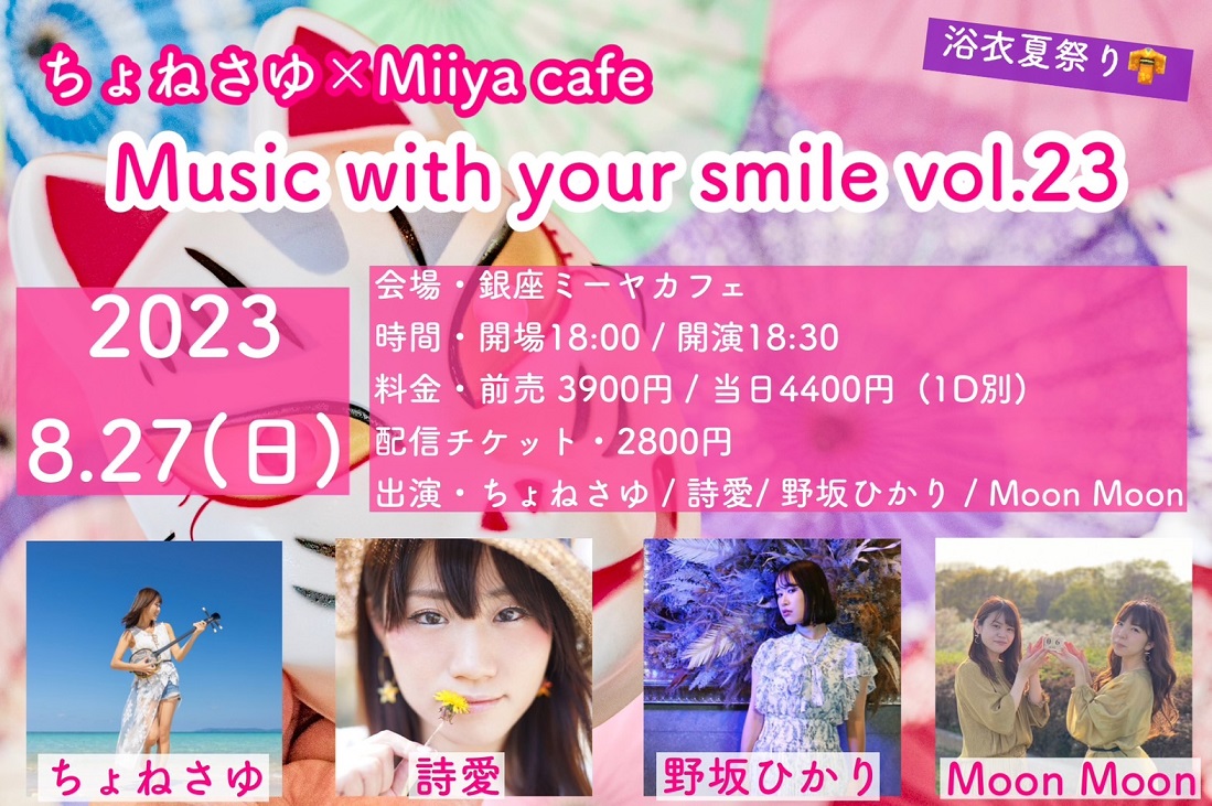 Night Time 有観客+配信 ちょねさゆ×Miiya Cafe Presents 『 Music with your smile vol.23 ~ 浴衣夏祭り ~』18:00open / 18:30start Charge 前売り3,900円 / 予約4,400円 +drink order(600円) 【配信チケット】2,800円(税込) ※ちょねさゆさんとMiiya Cafe共催イベントです♪ ※浴衣イベントになります!! = 出演 =※来場チケットは、各アーティストさんまで 配信チケットはこちらからアーティスト応援ギフト |