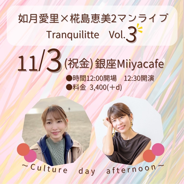 Day Time 有観客+配信 如月愛里×椛島恵美2マンライブ 『tranquillite』vol.3〜culture day afternoon〜12:00open / 12:30start Charge 3,400円 +drink order(600円) 【配信チケット】2,500円(税込) ※如月愛里さんと椛島恵美さんによるツーマンライブです♪ = 出演 =※来場チケットは、各アーティストさんまで 配信チケットはこちらからアーティスト応援ギフト |