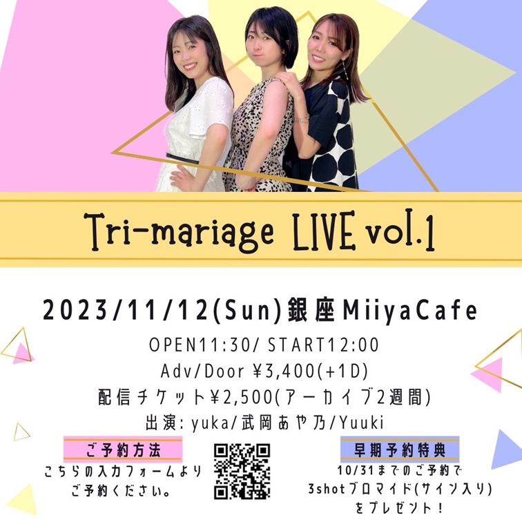 Day Time 有観客+配信 『 Tri-mariage LIVE Vol.1 』11:30open / 12:00start Charge 前売り・予約・当日 3,400円 +drink order(600円) 【配信チケット】2,500円(税込) ※yukaさん主催のスリーマンライブです♪ = 出演 =※来場チケットは、各アーティストさんまたは来場予約フォームまで 配信チケットはこちらからアーティスト応援ギフト |