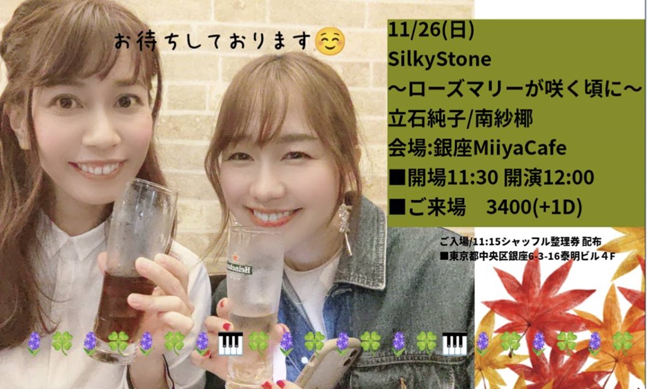 Day Time 有観客+配信 『 SilkyStone 〜ローズマリーが咲く頃に〜 』11:30open / 12:00start Charge 前売り・予約3,400円 / 当日3,900円 +drink order(600円) 【配信チケット】2,500円(税込) 立石純子さんと南紗椰さん共催のツーマンライブです♪ = 出演 =※来場チケットは、各アーティストさんまで 配信チケットはこちらからアーティスト応援ギフト |