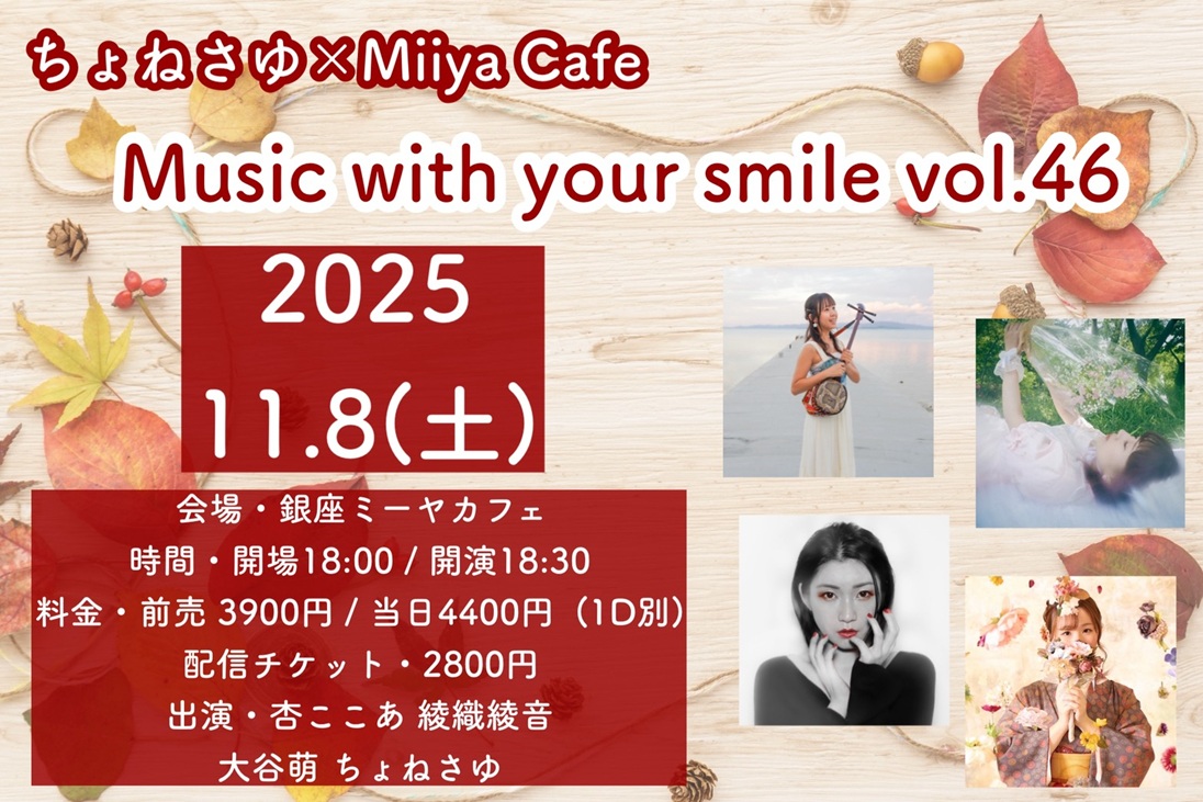 Night Time 有観客+配信 ちょねさゆ×Miiya Cafe Presents 『 Music with your smile vol.46 』18:00open / 18:30start Charge 前売り3,900円 / 予約4,400円 +drink order(600円) 【配信チケット】2,800円(税込) = 出演 =